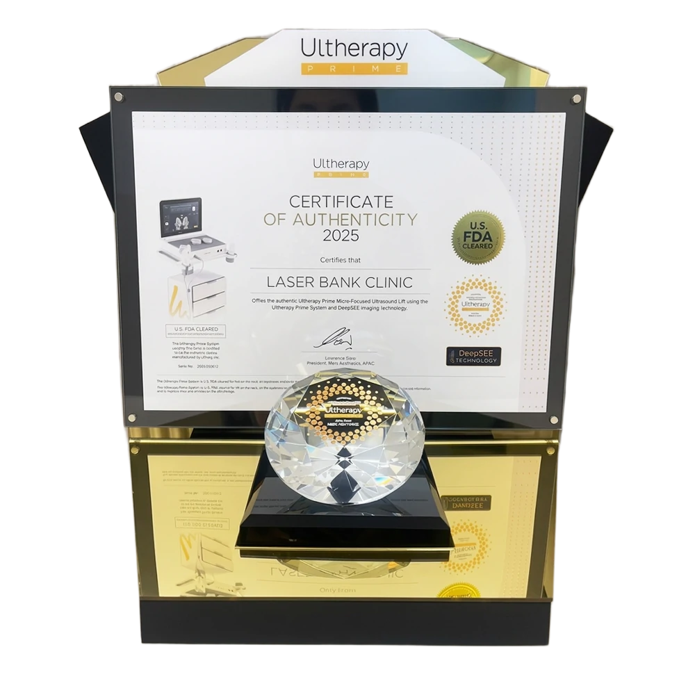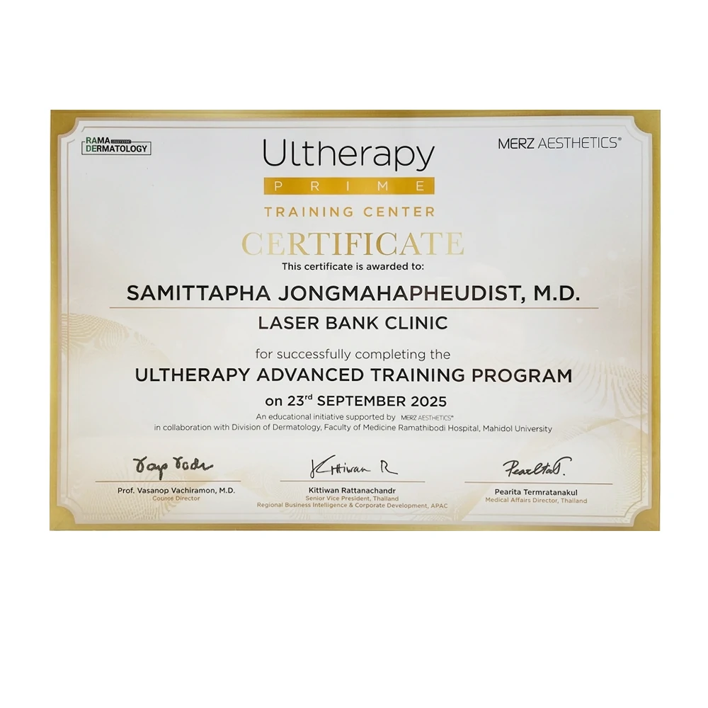 Laser Bank Clinic มอบมาตรฐานระดับประเทศให้กับผู้ใช้บริการในระดับสากล เห็นจากการได้รางวัลระดับสากลมากสุดระดับประเทศต่อเนื่องทุกปีไม่ว่าจะเป็นการใช้หัวแท้ เครื่องแท้ Program Ulthera Transducer หรือ 5Million Counting Treatment Program Thermage FLX และอื่นๆอีกมากมาย